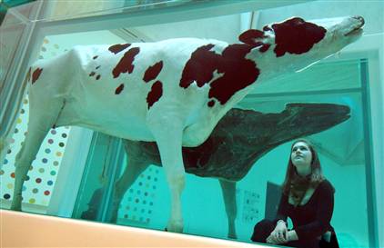 A teraz coś ze światowej półki wartej miliony. Damien Hirst - artysta, który lubi szlachtować i wrzucać do formaliny zwierzęta. Czasem nawet w całości je wrzuca, ale to już jest nudne, tak w całości, a poszatkowane chyba jeszcze nie. Hirst wrzucił do formaliny rekiny, krowy, baranki, owce, psy i świnie. (Jakaś ubojnia ma radochę.) Człowieka wrzucać nie ma w planach, tak powiedział.